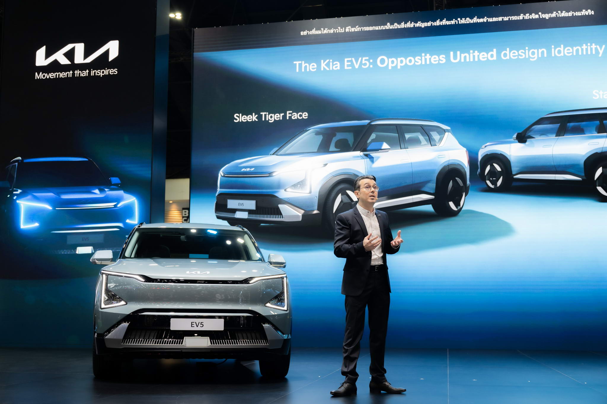 a Kia Sales (Thailand) Company Limited termék- és marketing részlegének alelnöke elárulta: „A Kia EV5 a 2. teljesen elektromos motorunk a sorozatban. A jármű a márka dedikált EV platformján alapul, amely szilárd alapként szolgál a jármű teljesítményéhez, és hozzájárul a kivételes általános vezetési teljesítményhez. A Kia egyedi tervezési filozófiája, az „Oposites United” sziluettje által formált Kia EV5 az elektromos mobilitás és a jellegzetes SUV-dizájn új korszakát nyitja meg, a kiemelkedő sokoldalúságot és kényelmet a fejlett technológiával, dinamikus teljesítménnyel és úttörő biztonsággal kombinálva harmonikusan biztosítva. kiegyensúlyozott jármű. A belső teret teljesen újragondolták, ihletet merítve a nemrégiben bemutatott nagyobb Kia EV9-ből, amelynek tágas belső terei koncepciójukban és kivitelezésében inkább hasonlítanak egy otthoni társalgóhoz, mint egy hagyományos autókabinhoz. A Kia EV5 termékpalettánk a thai piacon a játékot megváltoztató és modellgyorsítónk, amely a fiatalabb városi évezredeket, párokat és fiatal családokat célozza meg, akik „Életújítóknak” és „Trendalapoknak” nevezik magukat, akik intelligens és egyedi, teljesen elektromos járművet keresnek. amely a sokoldalúság, a stílus és a tágasság tekintetében valódi közepes méretű SUV-jellemzőket testesít meg.”