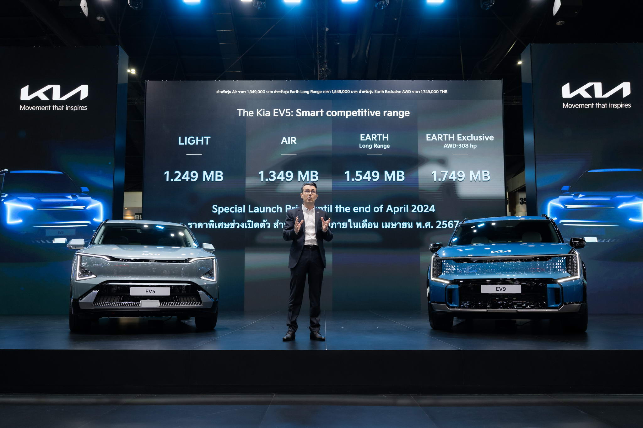 első teljesen elektromos, sokoldalú, közepes méretű SUV Thaiföldön, megerősítve a vállalat elkötelezettségét az elektromos járművek népszerűsítésének felgyorsítása mellett, és a fogyasztók számára egyre bővülő elektromos autók kínálatát Thaiföldön. Az évezredes fiatal párokat és családokat megcélzó Kia EV5 az elektromos mobilitás és a jellegzetes SUV-dizájn új korszakát nyitja meg, amely a kiváló sokoldalúságot és kényelmet a fejlett technológiával, dinamikus teljesítménnyel, úttörő biztonsággal és kategóriájában legjobb elektromos hatótávval ötvözi . A Kia EV5 sorozat négy változatban lesz elérhető Thaiföldön: akciós indulási áron 2024. április 30 – ig : Light 1 249 000 baht, Air 1 349 000 baht, Earth Long Range 1 549 000 baht és Earth Exclusive, 040 baht. . Minden változathoz vonzó csomag tartozik, amely 7 év garanciát tartalmaz, 7 év ingyenes, 24 órás közúti segélyszolgálat, ill 8 év akkumulátor garancia az ügyfelek számára akik április 30- ig előre foglalnak . A Kia EV5 előzetesen foglalható lesz a Kia standján a 45. Bangkoki Nemzetközi Autószalonon, amely órától kerül megrendezésre. 2024. március 2. és április 7. között a Challenger Hall 2 – ben , Impact Muang Thong Thaniban, valamint a Kia márkakereskedésben országszerte.